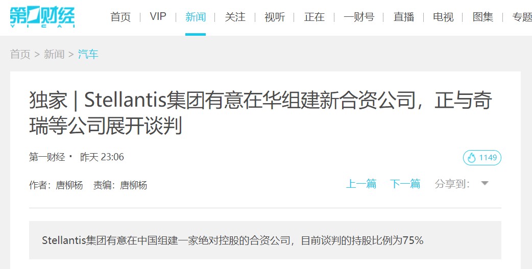据第一财经报道,新集团Stellantis有意在中国组建一家绝对控股的合资公司,目前谈判的持股比例为75%,业务范围包括商用车、乘用车、新能源汽车等。该媒体报道,Stellantis集团正在与奇瑞汽车、广汽集团展开洽谈。